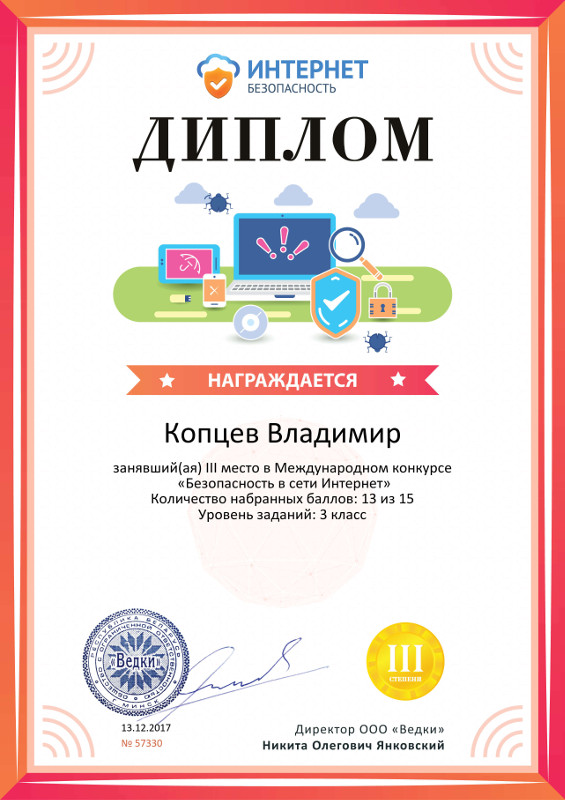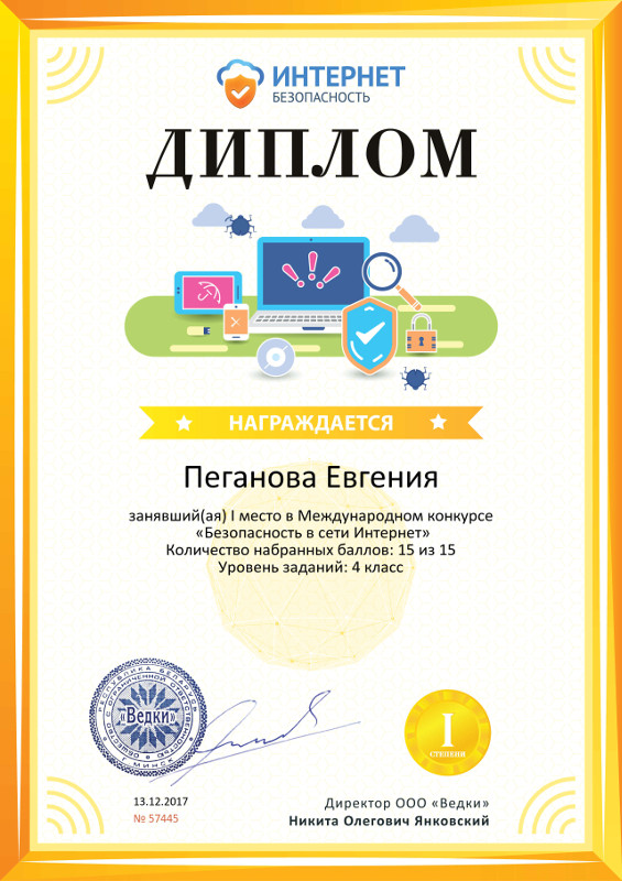 С 1 по 11 декабря 2017 года воспитанники МБУ ДО «ЦИТ» Копцев Владимир 3 кл, Гаврилова Дарья 4 кл. и Пеганова Евгения 4 кл. приняли участие в Международном конкурсе «Безопасность в сети Интернет».