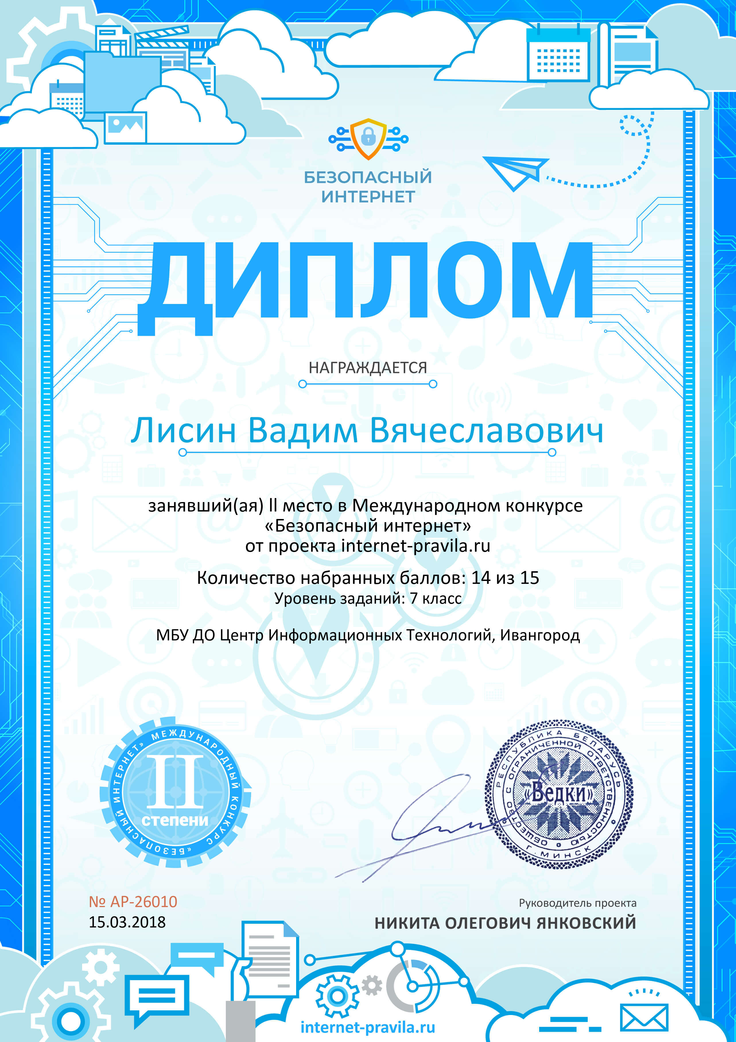 - Дипломы 2 степени — Дементьев Захар, Журавлев Афанасий и Лисин Вадим.