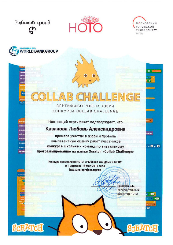 Как мы писали ранее, в апреле 2018 года воспитанники клуба робототехники «Леонардо» принимали участие в «Scratсh хакатоне», который был организован на портале «КОД-КЛАСС». По окончании хакатона, стартовал конкурс командного программирования на языке Scratch Collab Challenge. Организатором конкурса выступил Рыбаков фонд совместно с Московским городским педагогическим институтом (МГПУ) при поддержке АНО ЦРСИ «Проектория» и проекта «Твой курс: ИТ для молодежи».