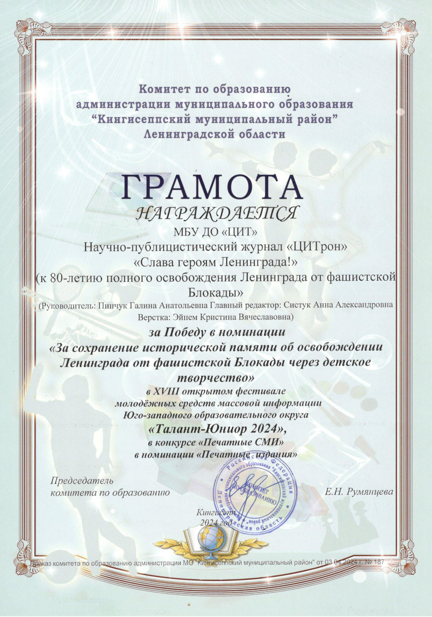 16 выпуск журнала ЦИТрон, посвященный 80-летию полного освобождения Ленинграда от фашистской Блокады, номинировался в конкурсе «Печатные СМИ» (номинация «Печатные издания») XVIII открытого фестиваля молодежных средств массовой информации «Талант-Юниор 2024».